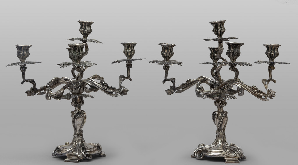 Coppia di candelieri in argento finemente sbalzato a cinque luci argentiere Chiappe
