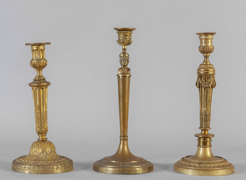 Tre candelieri di cui due in bronzo dorato del sec.XIX e uno in rame dorato del sec.XVIII