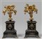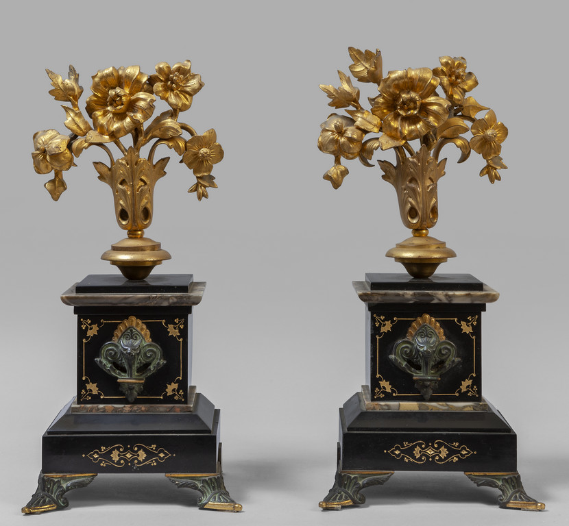 Coppia di fiori in bronzo dorato poggianti su basi in marmo nero intarsiato fine sec.XIX