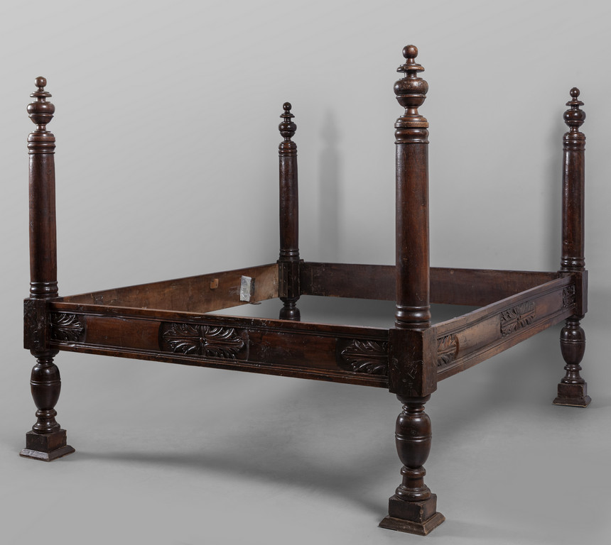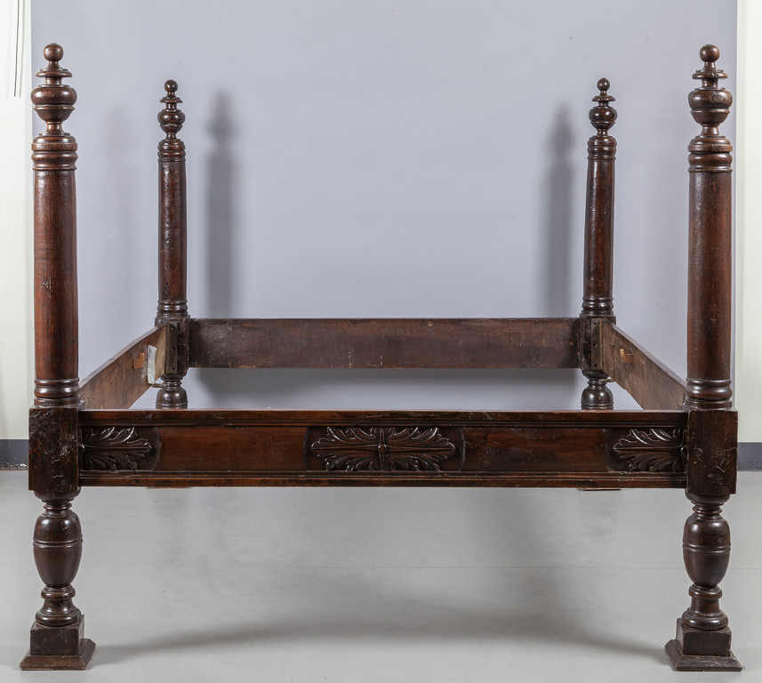 Letto a colonne in noce frontale intagliato Toscana sec.XVII