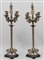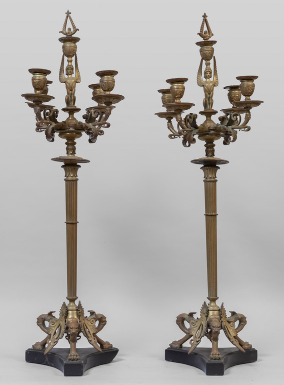 Coppia di grandi candelieri umbertini in bronzo dorato a cinque luci con bobeche centrale sorretta da sfinge base in marmo