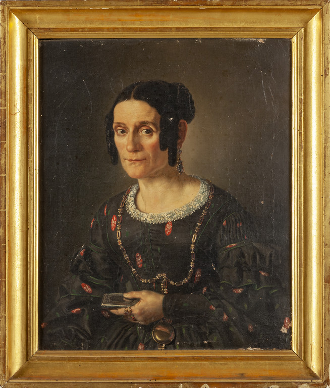 'Ritratto di dama con trousse' olio inizi sec.XIX