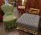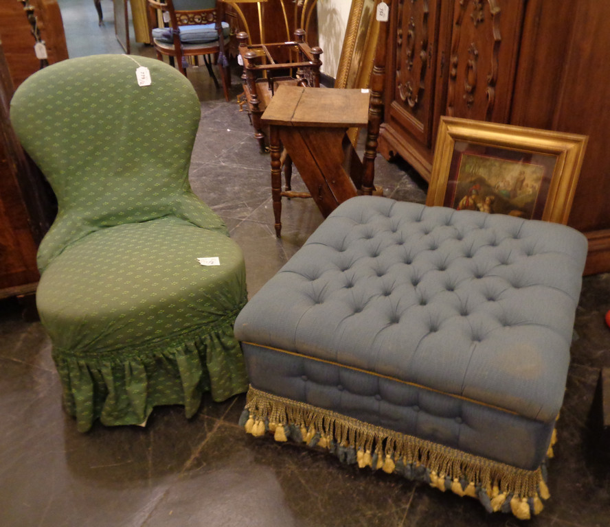 Seggiolina della nonna e puof quadrato ricoperto in stoffa blu