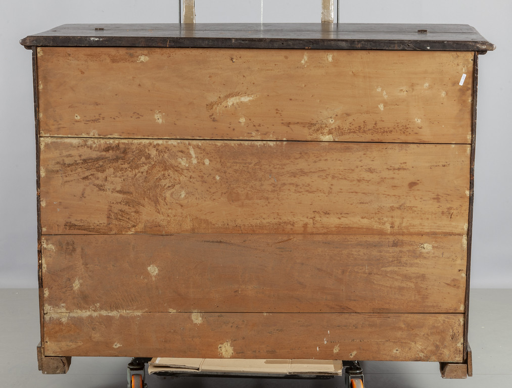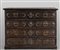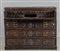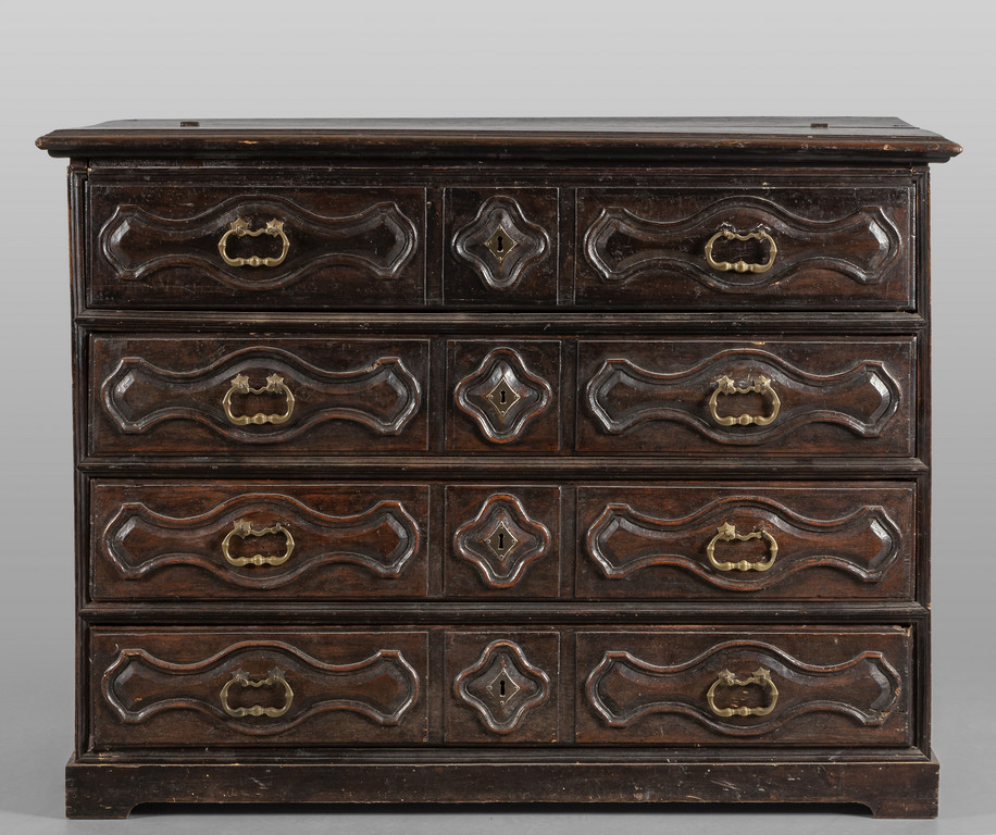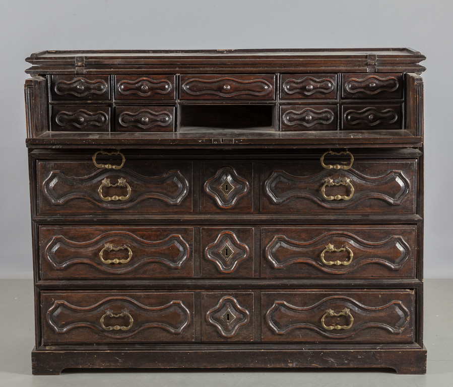 Canterano Luigi XIV in noce intagliato sul fronte e sui fianchi quattro cassetti di cui il primo si ribalta a scrittoio con nove cassettini all'interno Piemonte I metà sec.XVIII
