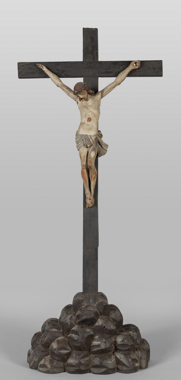 Crocefisso in legno intagliato e laccato con base a roccaille Genova sec.XVIII