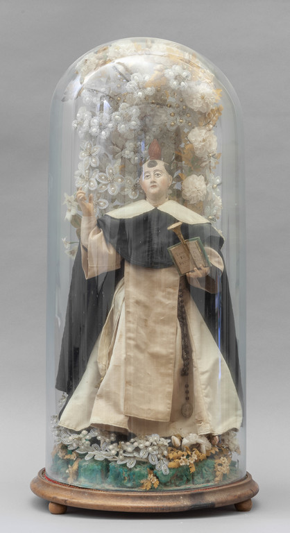 Santo domenicano scultura in terracotta policroma con ricca decorazione di fiori in perline di vetro sec.XIX dentro campana di vetro