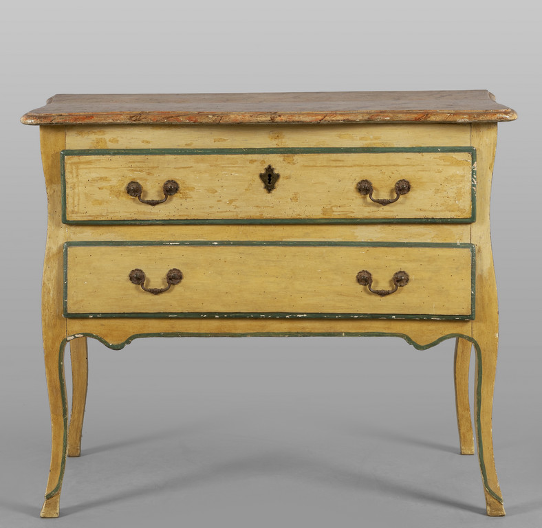 Comò a balestra due cassetti sul fronte laccato a fondo bianco con profili azzurri Toscana sec.XVIII