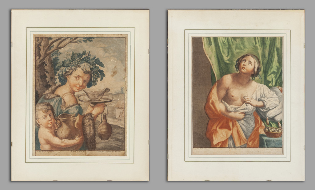 Bacco e Cleopatra coppia di stampe acquarellate da G.Reni