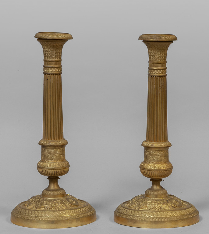 Coppia di candelieri in bronzo dorato con alla base strumenti musicali sec.XIX