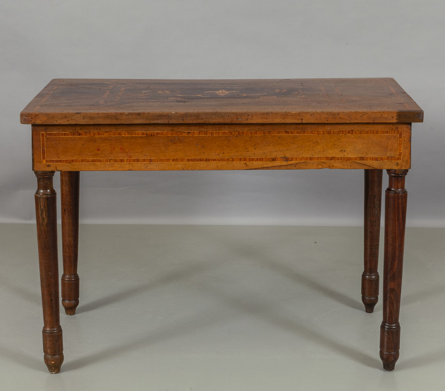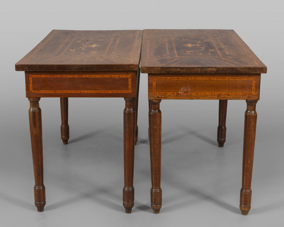 Coppia di consoles Luigi XVI in noce filettate in legno di rosa e di frutto Piacenza sec.XIX