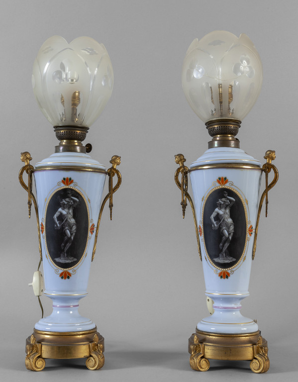 Coppia di lumi a petrolio in opaline azzurra decorati al centro con figura classica sec.XIX
