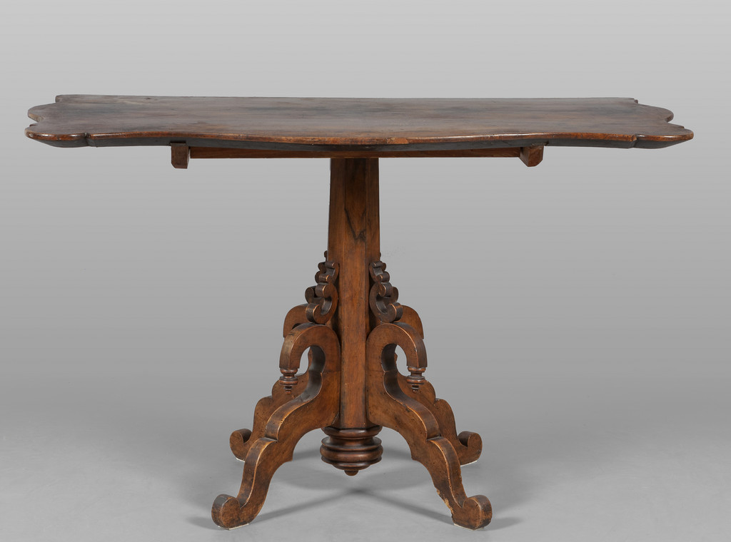 Tavolino con piano a vassoio lastronato in noce piede centrale sec.XIX