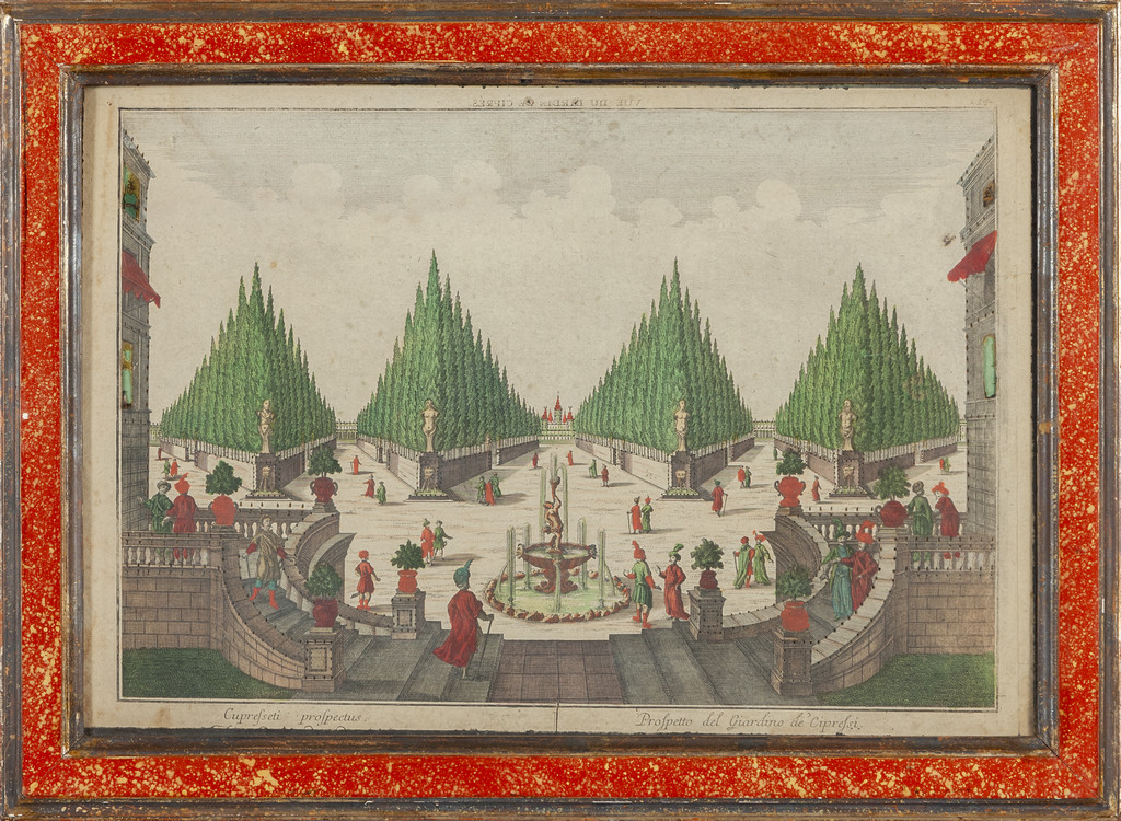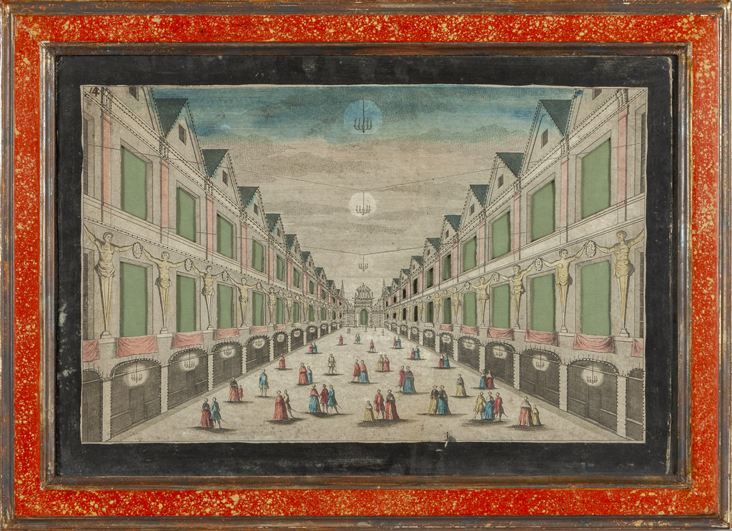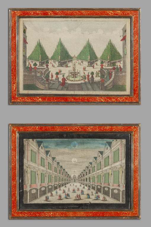 Vedute prospettiche coppia di stampe acquarellate cornici laccate a finto porfido sec.XVIII
