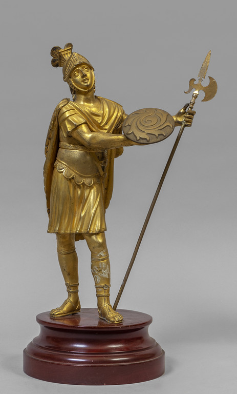 Guerriero con lancia e scudo scultura in bronzo dorato poggiante su base in legno Francia sec.XIX