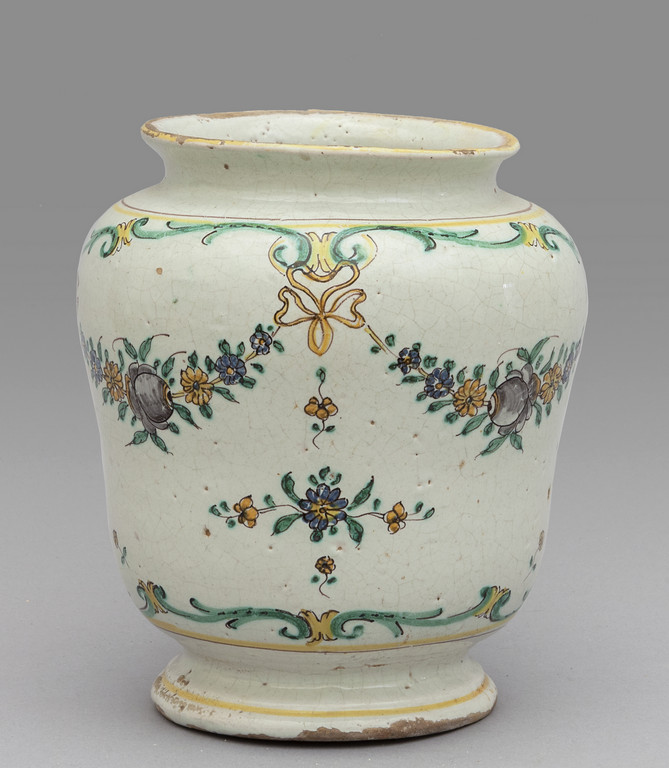 Vaso in ceramica decorato in policromia con fiori e festoni su fondo bianco Italia Meridionale inizi sec.XVIII