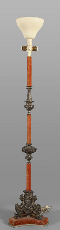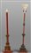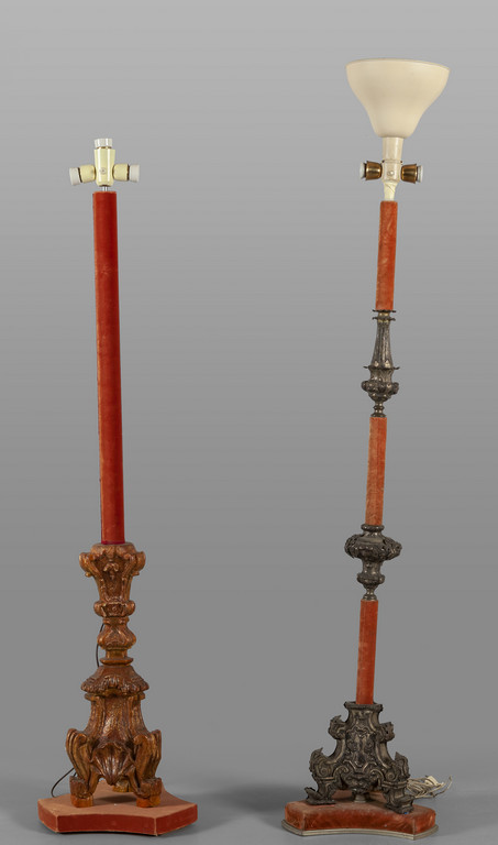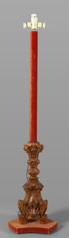 Una torciera realizzata con antico candeliere in rame sbalzato intervallato da velluto (h.cm.180) e torciera formata con candeliere antico in legno intagliato e dorato