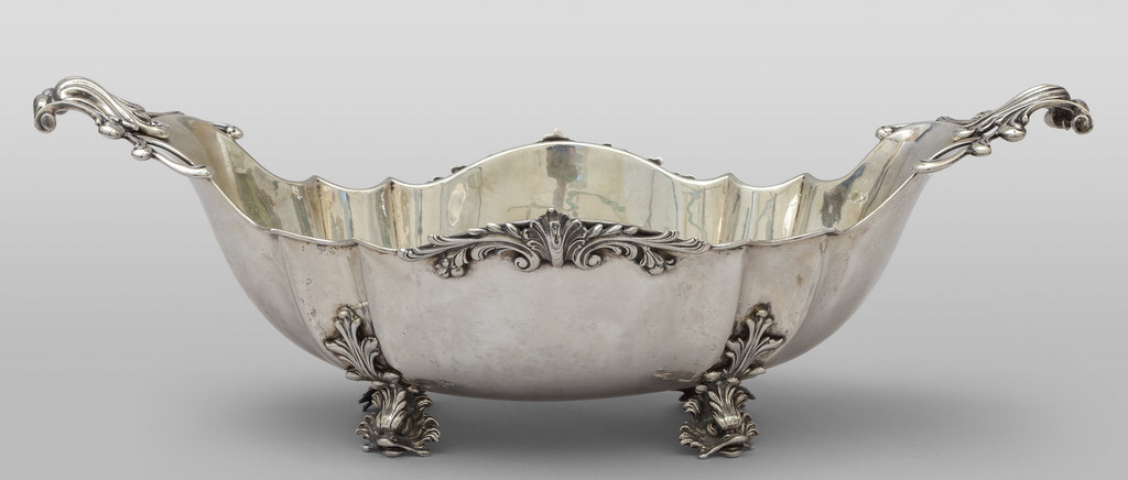 Centrotavola in argento finemente sbalzato in stile barocco con piedini a forma di delfini sec.XX