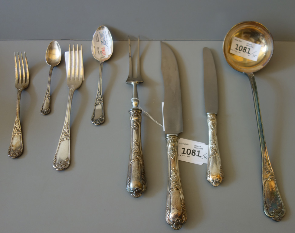Servizio di posate Broggi in metallo argentato inizi sec.XX composto da: 12 forchette grandi e 12 piccole 3 misure da 12 di cucchiai 12 coltelli grandi e 12 piccoli forchettone coltellone e mestolo