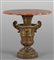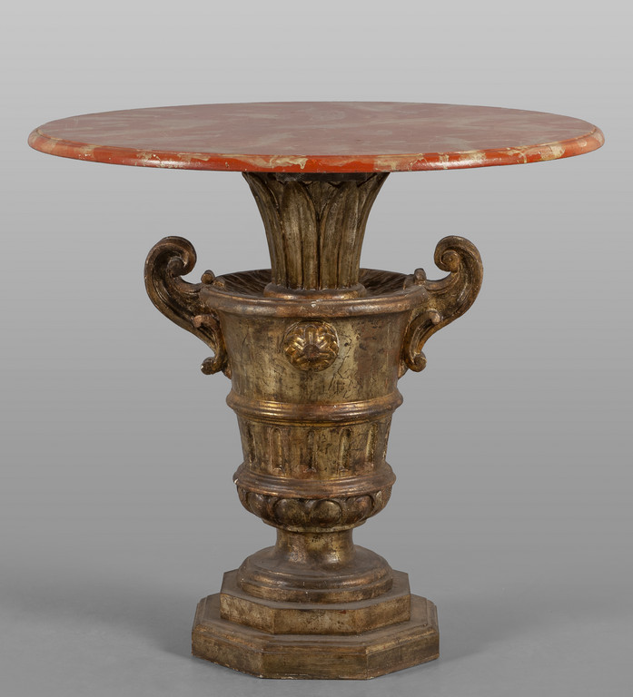 Tavolo rotondo composto da antico vaso in legno intagliato e dorato che sorregge un piano a finto marmo non coevo