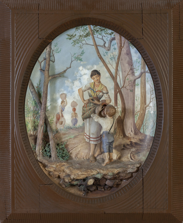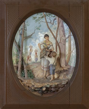 Acquaiola che da' da bere ad un bambino grande placca in porcellana policroma nel retro marchio 'Società Ceramica Richard Milano' cornice in legno fine sec.XIX