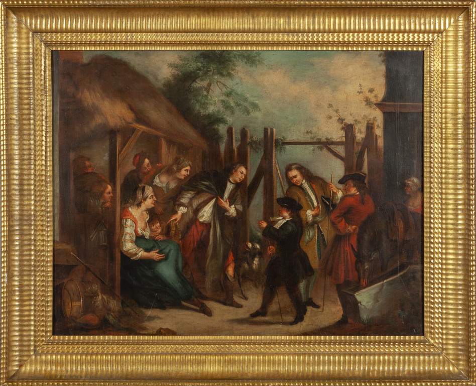 Scuola inglese sec.XVIII 'Scena di genere' olio cornice in legno intagliato e dorato