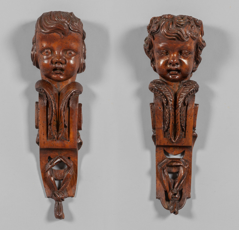 Coppia di cariatidi in noce intagliata con putti Lombardia sec.XVII