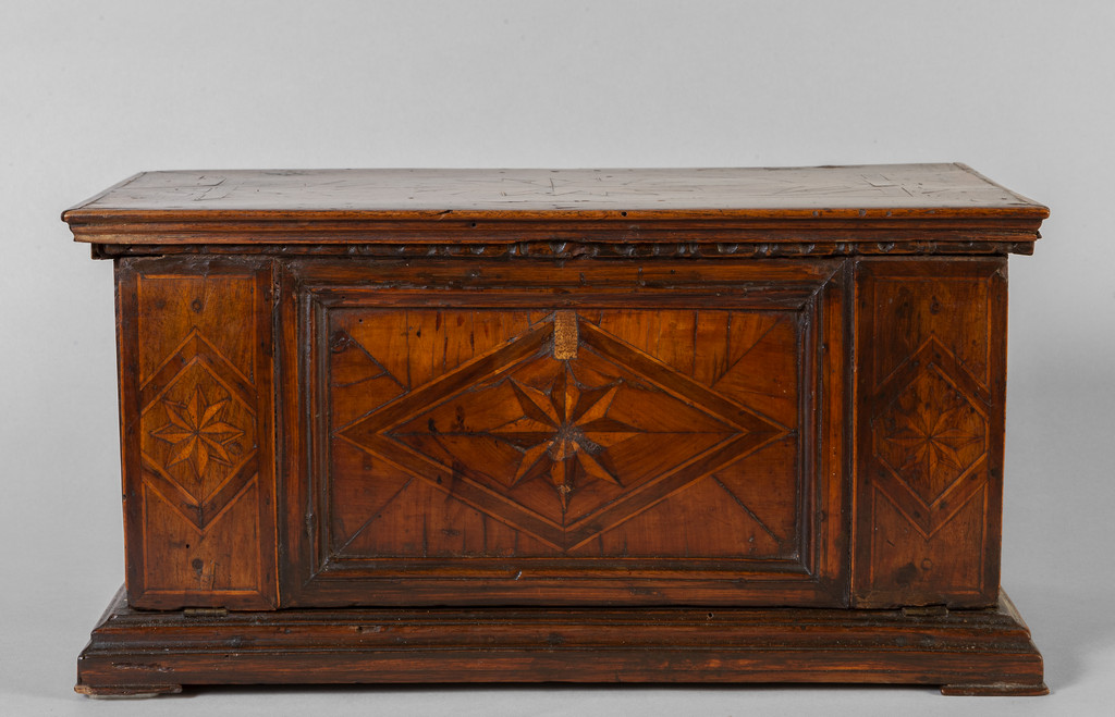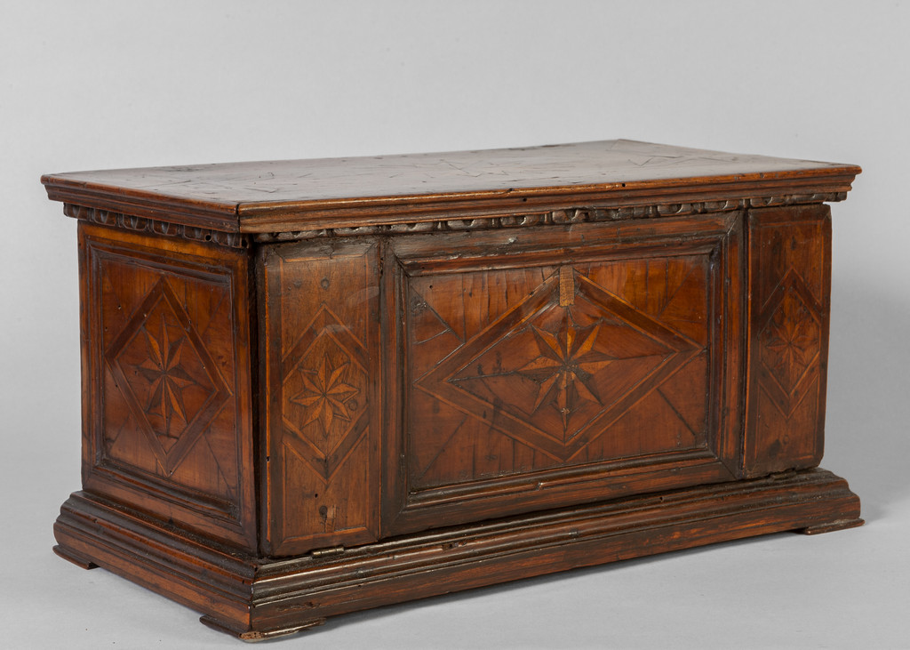 Modello di cassapanca in legno intarsiato a stella Nord Italia sec.XVII