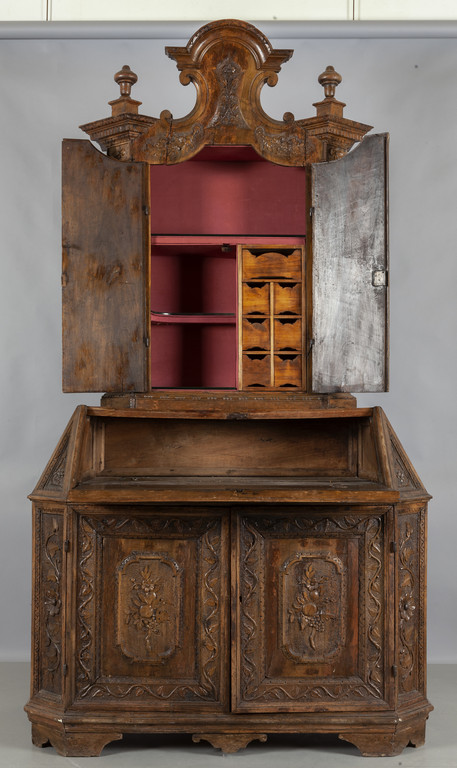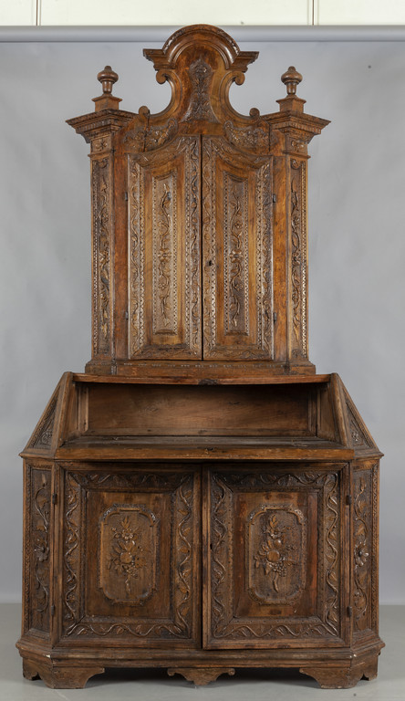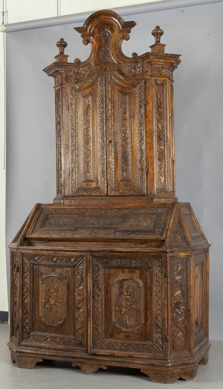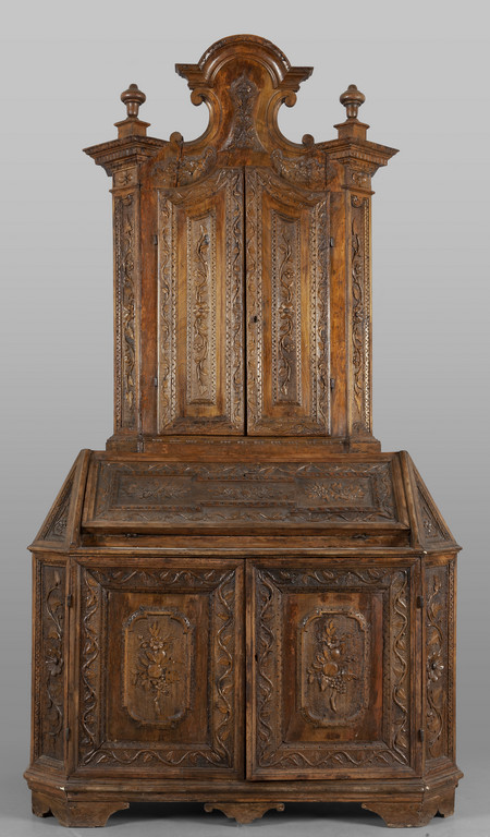 Credenza con alzata in noce riccamente intagliata montanti scantonati parte superiore a due sportelli Alto Veneto