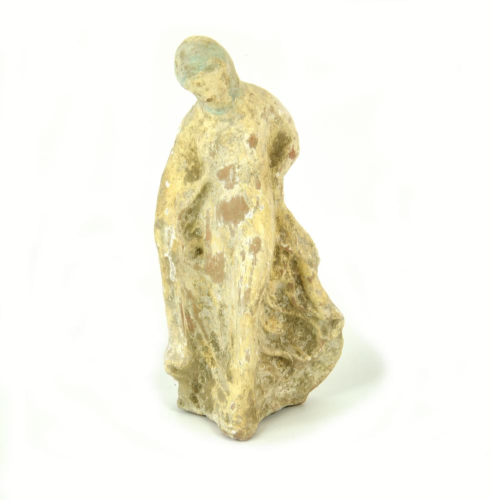 Statuetta di giovane donna velata incedente in avanti, la testa flessa avanti con lo sguardo rivolto in basso, stante sulla gamba destra arretrata, la sinistra flessa e portata in avanti; la giovane è completamente avvolta nel mantello che si apre in ampie pieghe per seguire il movimento della danza, il braccio sinistro portato indietro ed il destro avanti ad accompagnare il movimento dell'abito
