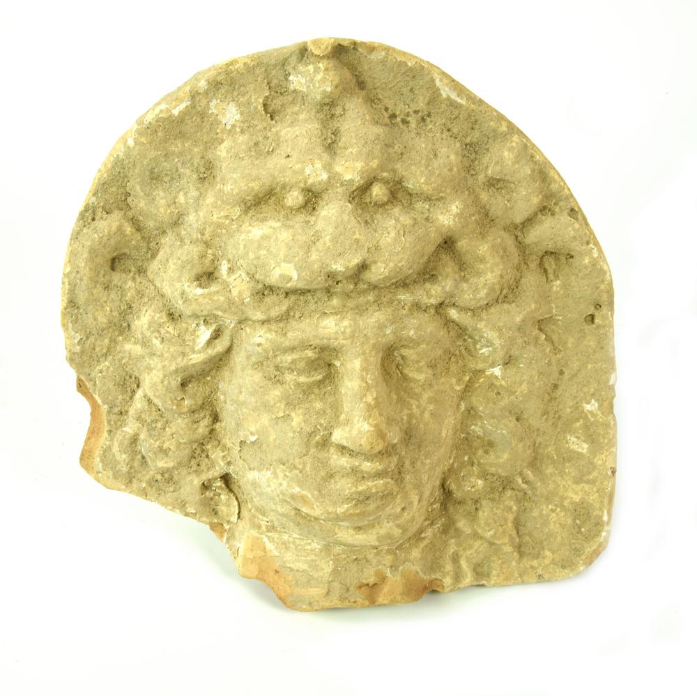 Antefissa ad arco con volto di Eracle in posizione frontale, con la leontè sulla testa e con folti capelli ricci che ricadono sul collo