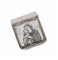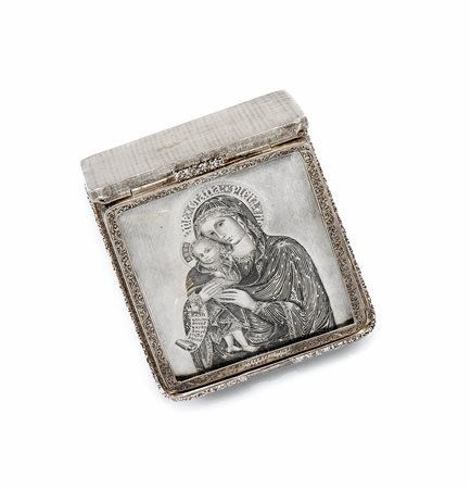 di forma rettangolare, in argento satinato con chiusura cesellata a piccole foglie, all'interno immagine della Vergine in argento inciso e cesellato, cm 5,7x4,8