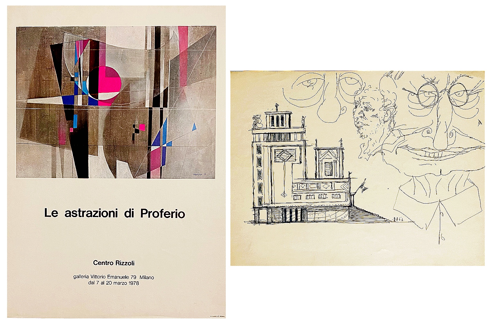 Immagine a sx: Grossi Proferio, Le astrazioni di Proferio, anno non dichiarato, Poster su carta, cm 70x50. Immagine a dx: Ferroni Gianfranco, Senza titolo, anno non dichiarato, matita su carta, cm 26.5x35. Provenienza: Avanguardie milanesi 1960-1980, dalla collezione privata di Franco Passoni (MI).