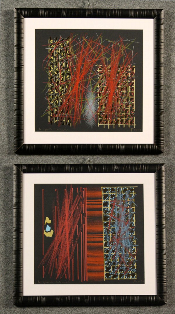 FINZI ENNIO - Nato a Venezia nel 1931. Ha partecipato a numerose esposizioni collettive, tra queste la Biennale di Venezia e la Quadriennale di Roma. Coppia di disegni su cartoncino colorato. Firmati in basso a destra. Con autentiche dell'artista su fotografia. In cornice. Mis. Lung. cm. 33 Alt. cm. 33 ca.