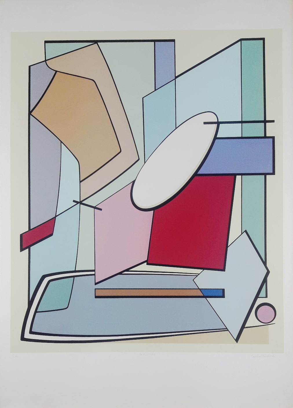 BADIALI CARLA Novedrate 1907-Como 1992 “Composizione” serigrafia a 22 colori su cartoncino Fabriano cm 49,5x69,5 del 1936. Firmato a matita sul fronte in basso a destra, datata al centro, tiratura P.A. a sinistra.