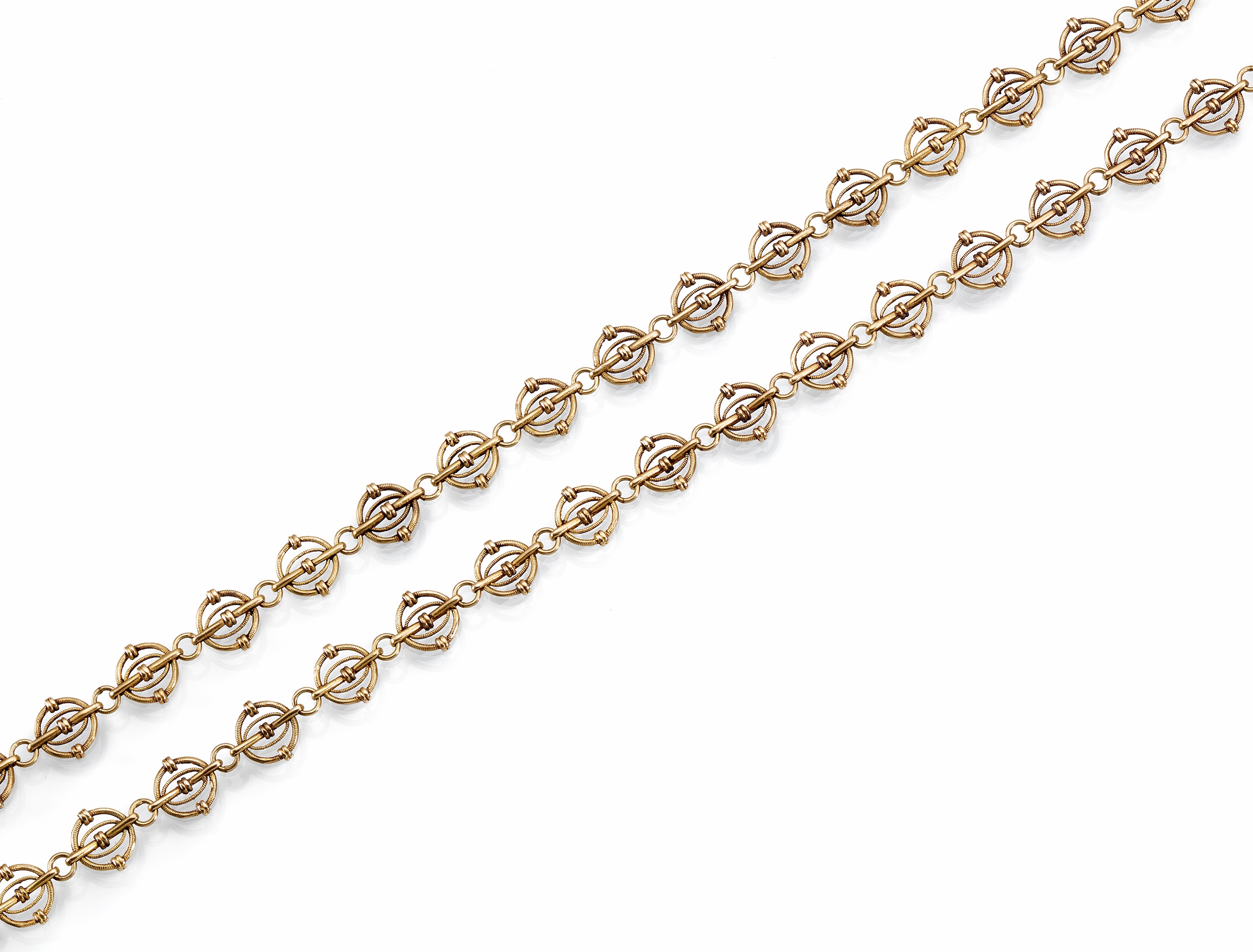 Lunga collana in oro giallorealizzata ad una fila di maglie circolari...