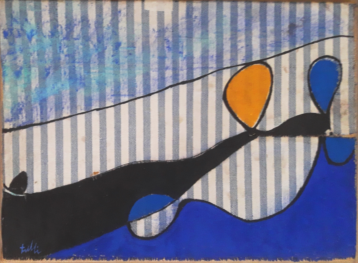 TULLI WLADIMIRO Macerata 1922-2003 “Senza titolo” acrilici e collage di tele di materassi su tela cm 45x33 del 1983 . Firmata sul fronte in basso a destra. Sul retro firmato e datato. Autentica su foto in fase di esecuzione.