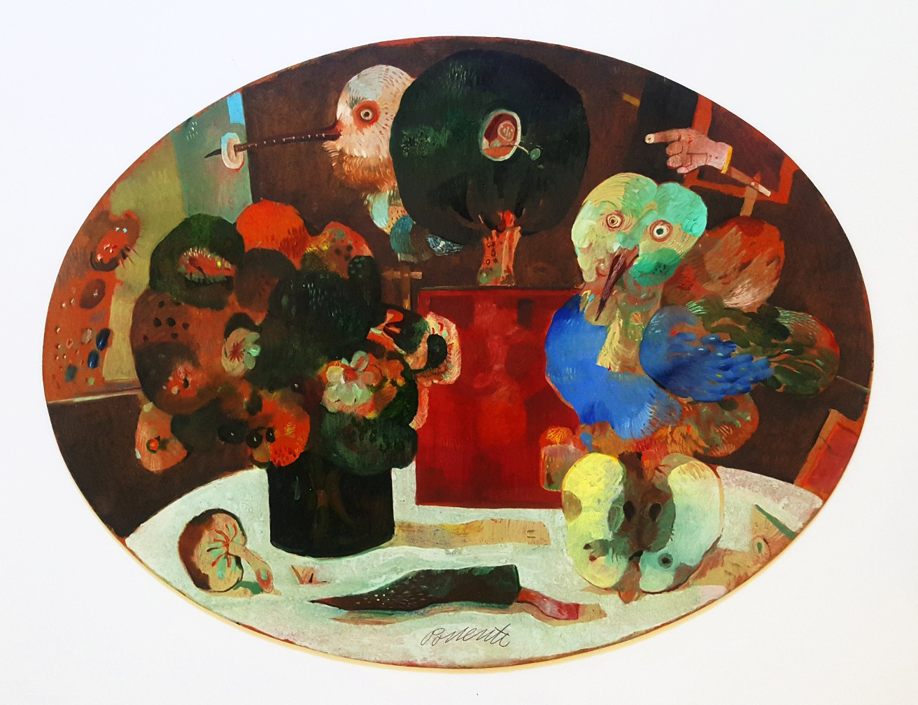 POSSENTI ANTONIO Lucca 1933-2016 “Senza titolo” olio su tavola cm. 42x30 (misura dell’ ovale) del 2000, firmato in basso al centro e sul retro. Autentica ed archiviazione su foto a cura dell’ archivio galleria Fantasio & Joe di Lucca più dichiarazione di altra casa d’aste.
