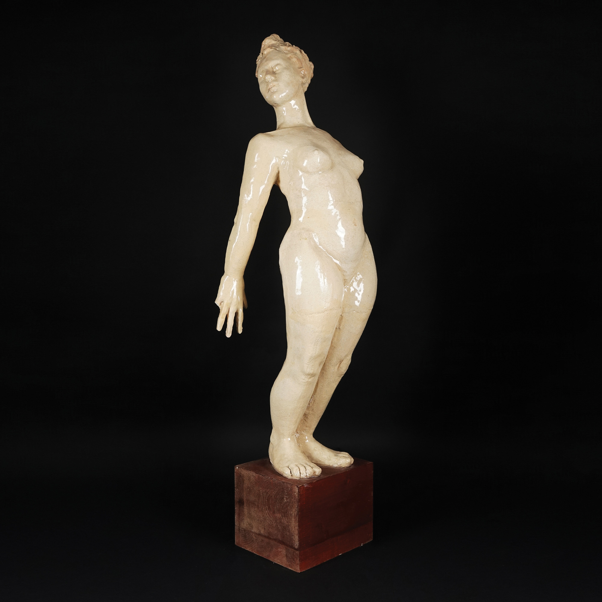 Scultura in ceramica bianca raffigurante un nudo femminile in piedi; base lignea.