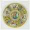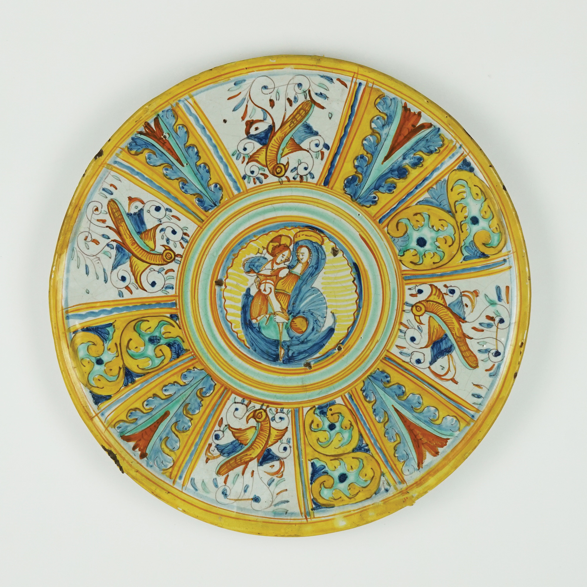 Grande piatto in maiolica bianca e policroma dipinto a quartieri nei toni del giallo, arancione, verde e azzurro a raffigurare sulla tesa motivi a voluta alternati a volatili; il cavetto è centrato dalla figura della Vergine col Bambino.