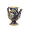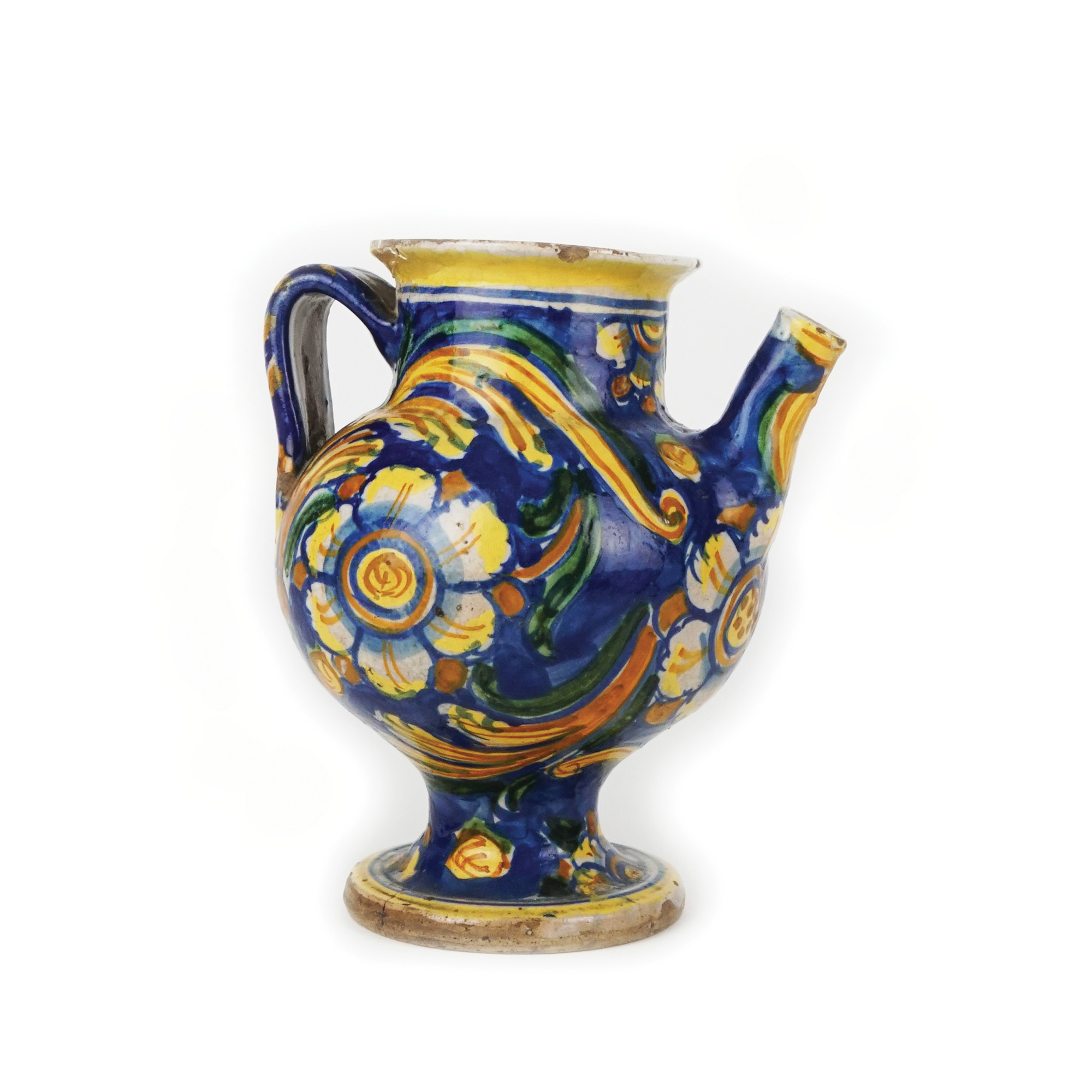 Versatoio in maiolica a fondo blu decorato "alla veneziana" nei toni del giallo, marrone, verde e celeste a corolle floreali fra lunghe foglie. Corpo globulare; corto beccuccio; ansa ricurva; piede circolare.