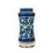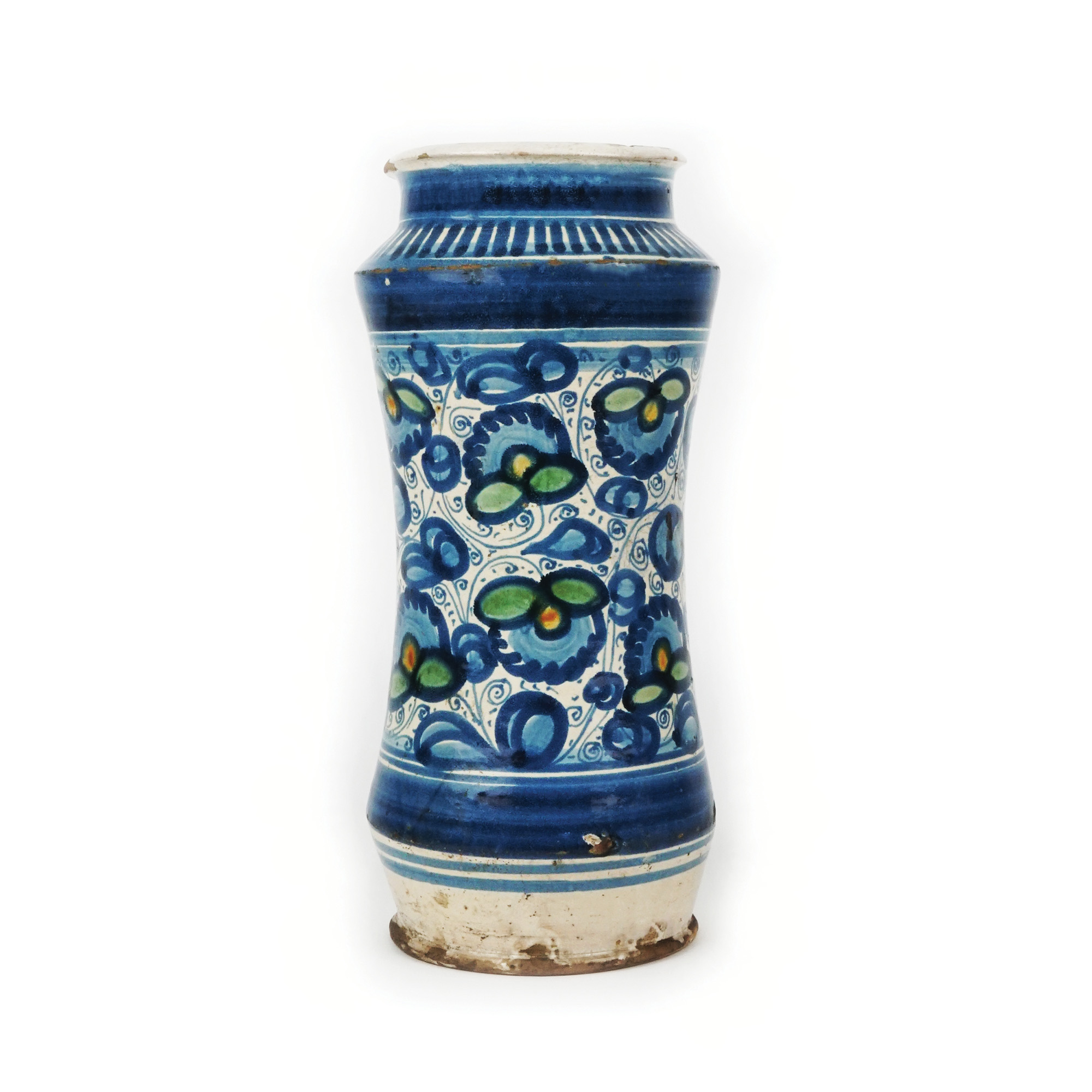 Albarello in maiolica bianca, blu, verde e gialla, dipinto a corposi motivi floreali.