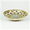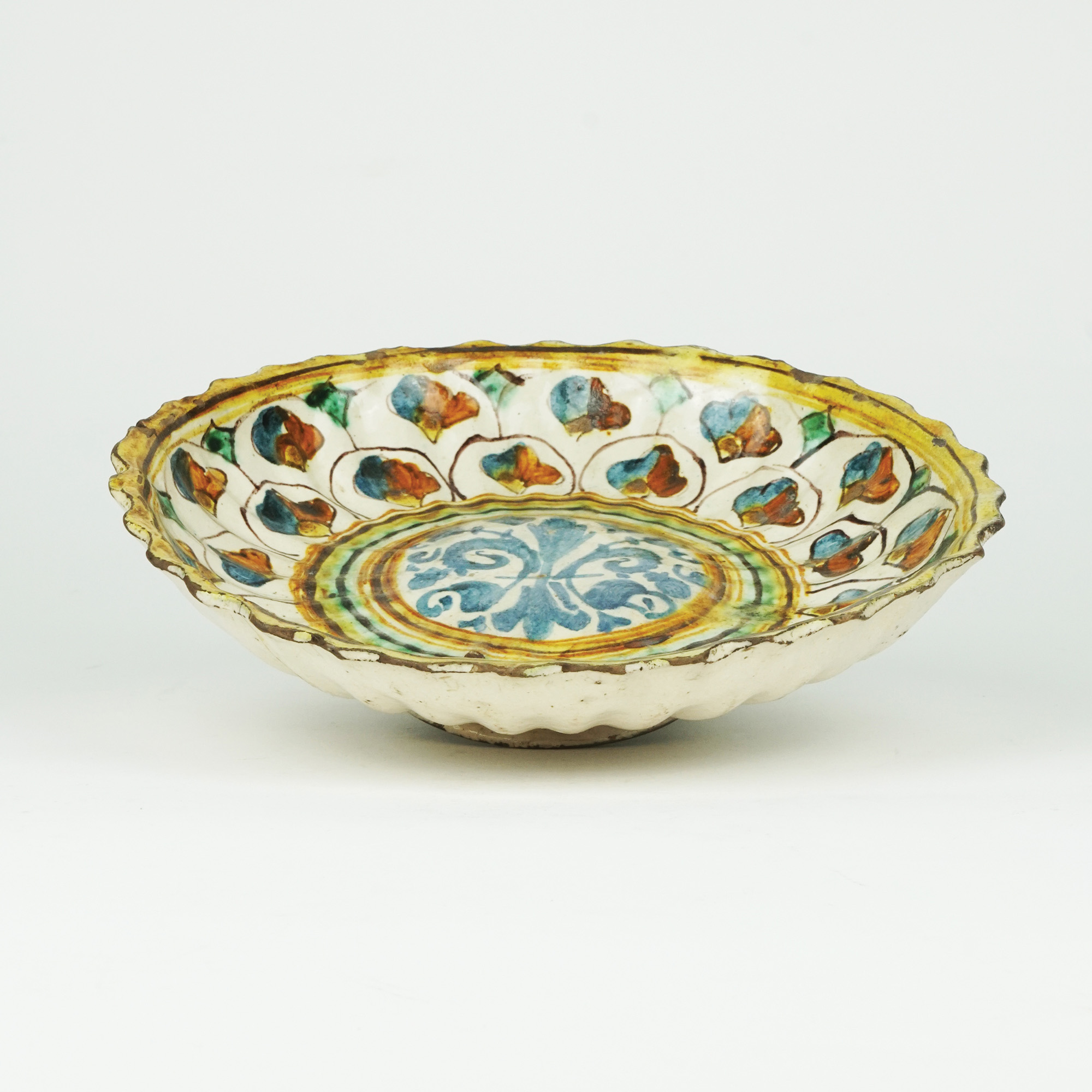 Crespina in maiolica a fondo bianco dipinta in policromia gialla, marrone, verde e blu a raffigurare nel cavetto costolato un elegante motivo a palmette centrato dal giglio fiorentino. Piede circolare.