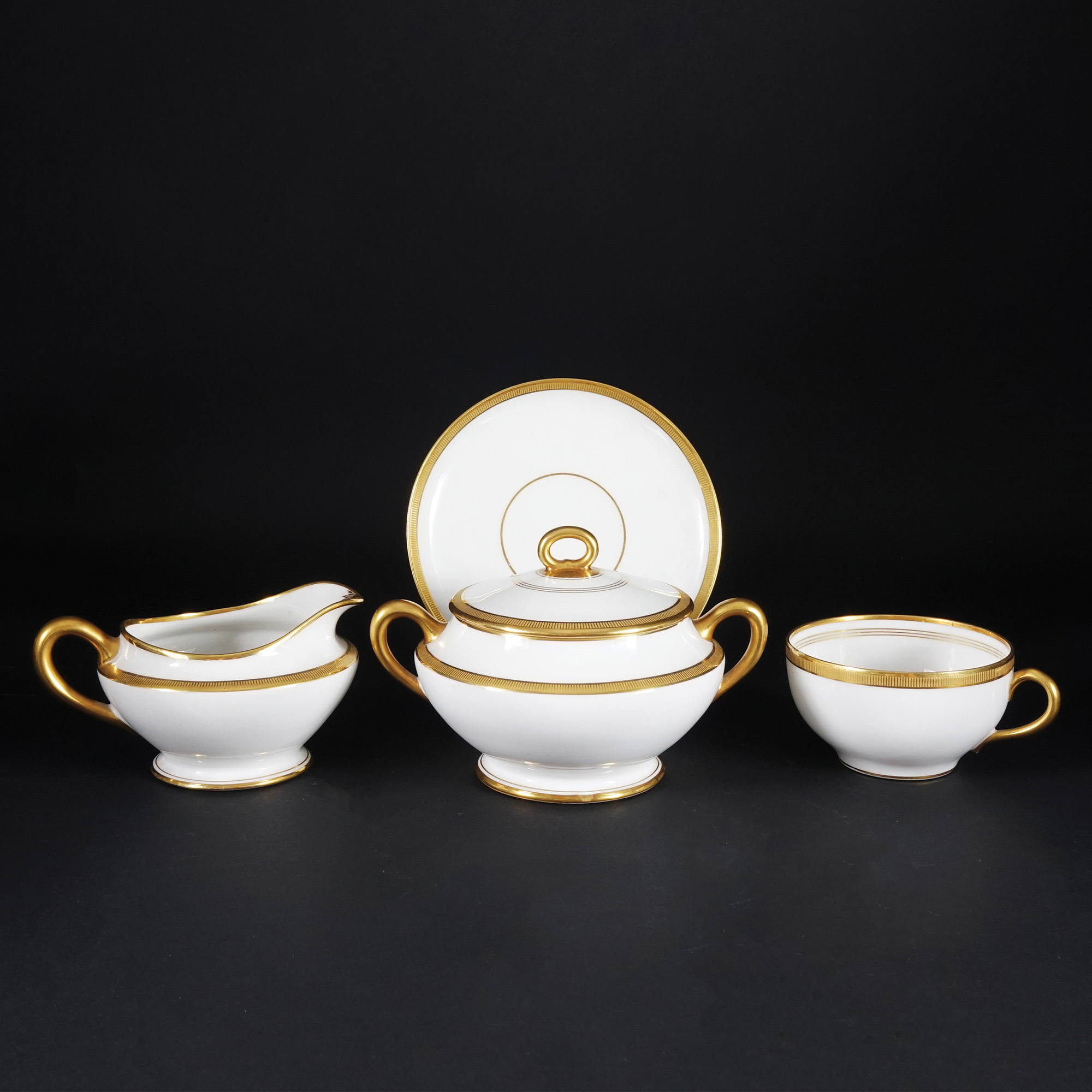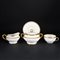 Tazza con piatto in porcellana bianca e dorata UNITA a una salsiera e una zuppiera con coperchio, parimenti in porcellana bianca e dorata.