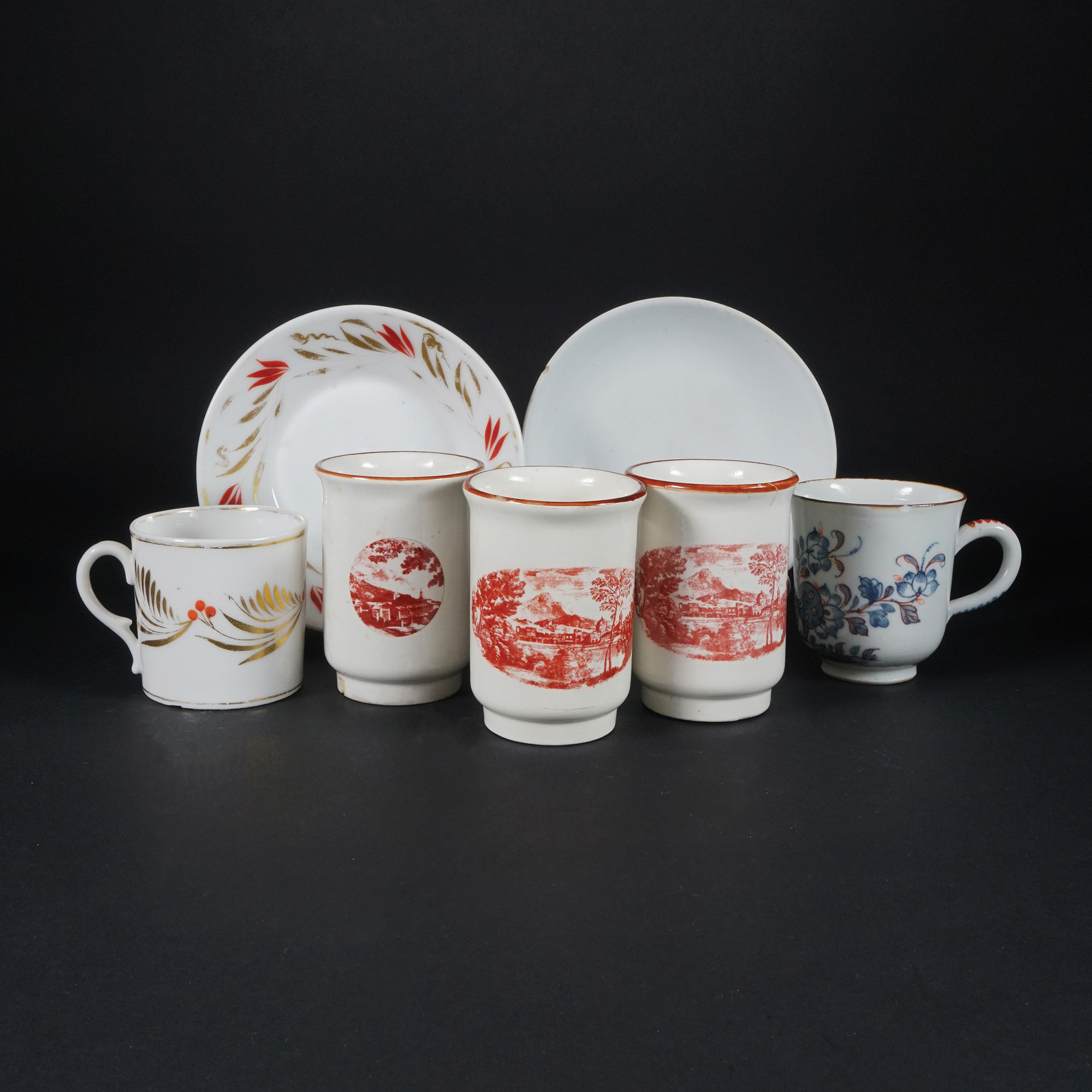 Tazza con piatto in porcellana bianca, rosso ferro e dorata, probabilmente manifattura francese, primo quarto del XIX secolo, la tazza: cm. 6x6; il piattino: d. cm. 12,7 (il piatto non pertinente) UNITA a tre bicchieri in terraglia, manifattura Coronelli Cunardo, XX secolo, h. cm. 8,5, a un piattino in porcellana bianca, manifattura Ginori, ultimo quarto del XVIII secolo, d. cm. 11,8 e a una tazza in porcellana orientale a decorazione Imari, cm. 6,8x6,3