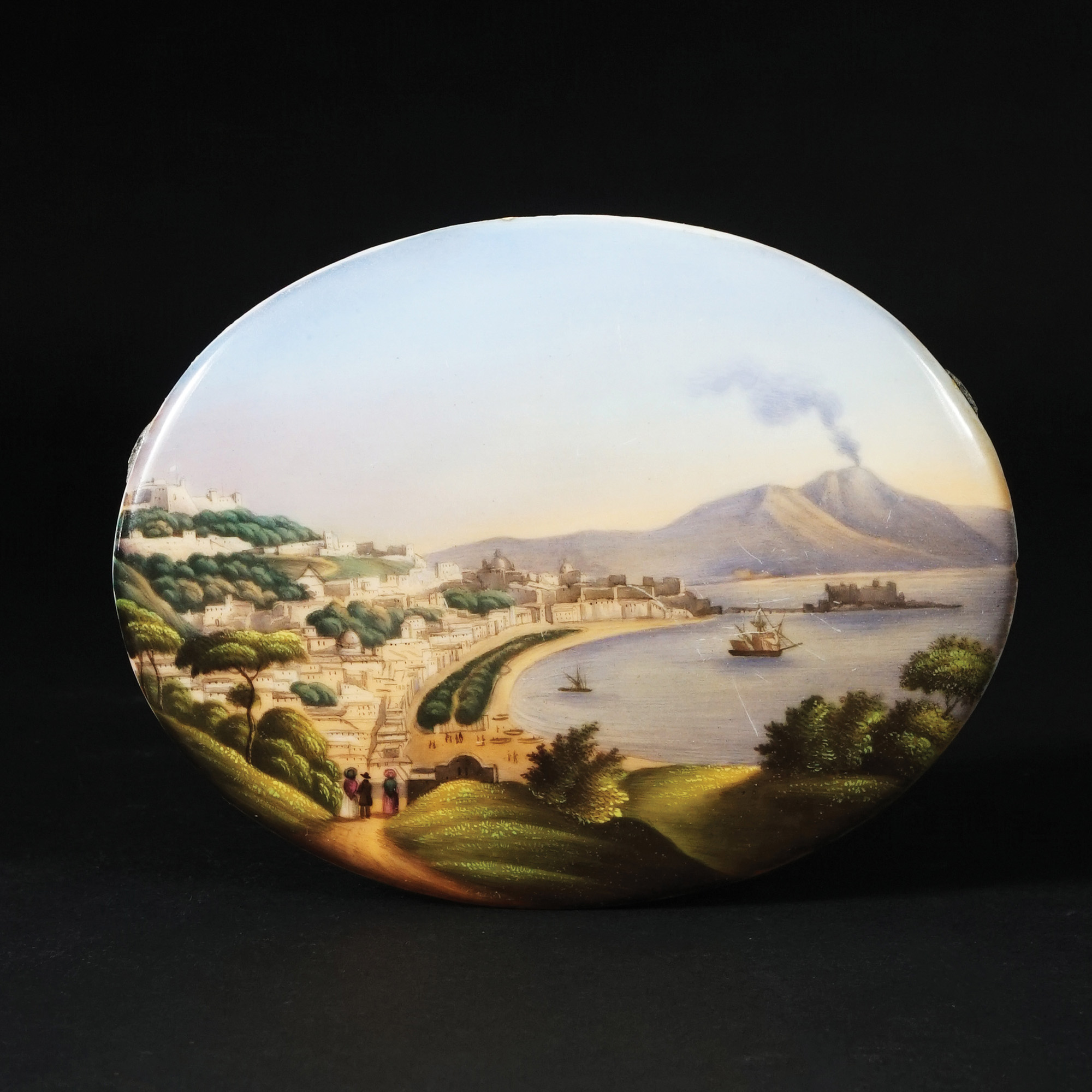 Placca in porcellana bianca e policroma di forma ovale raffigurante la Vista della Riviera di Chiaia a Napoli.