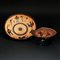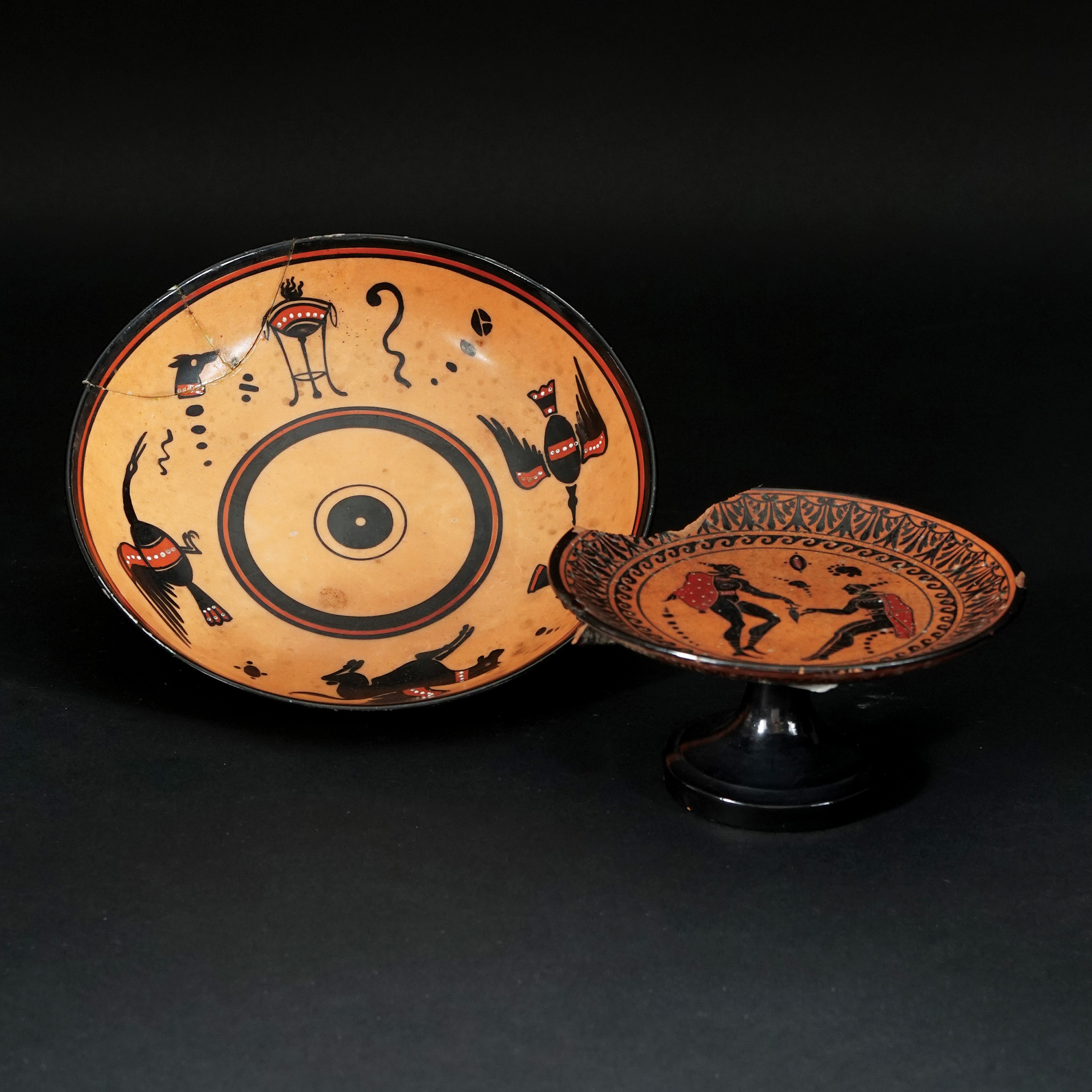 Piccola alzata UNITA a piatto in terraglia arancio, rossa e nera, dipinta a motivi all'Ercolana.