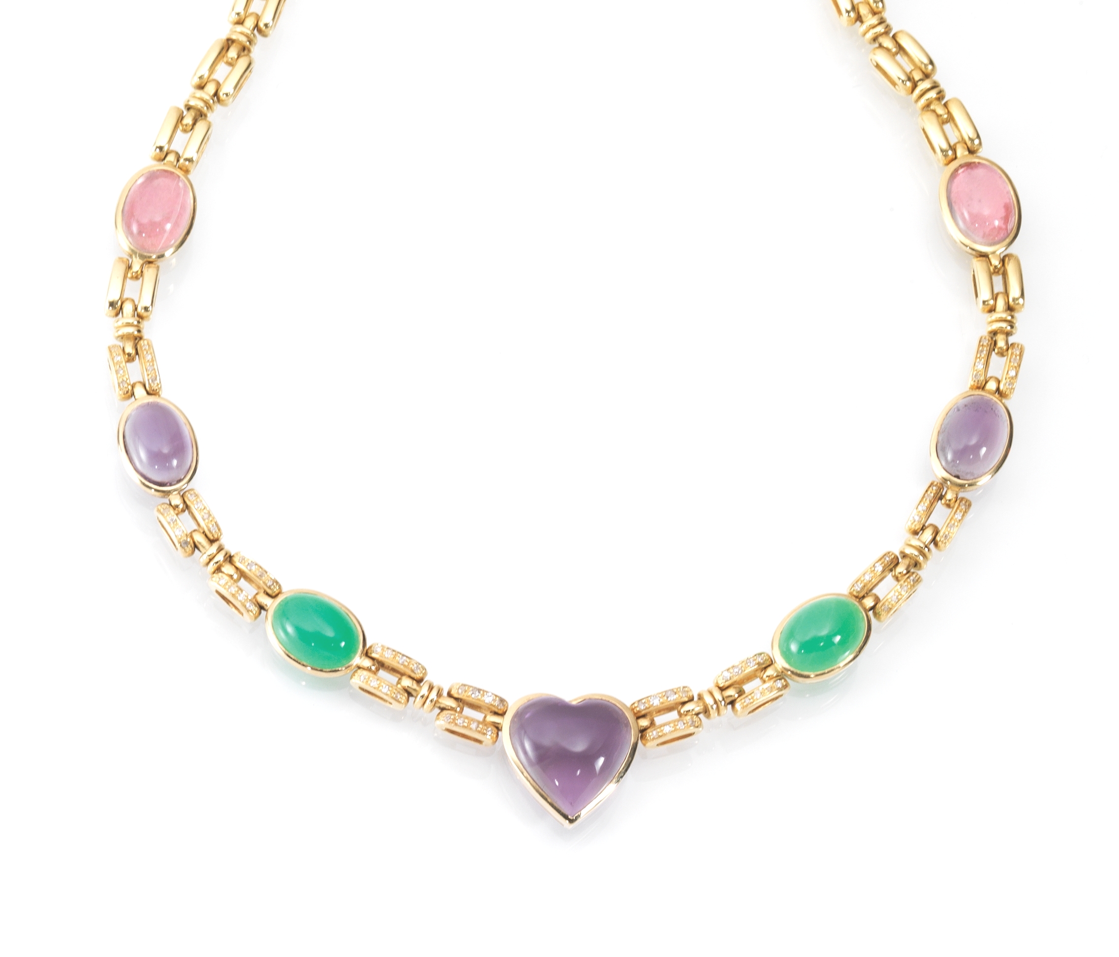 reallizzata ad una fila di maglie rettangolari traforate in oro giallo decorate nella parte centrale da piccoli brillanti ed intercalata da ametiste, quarzi e crisoprasi cabochon ovali, al centro elemento a cuore in ametista, g 105