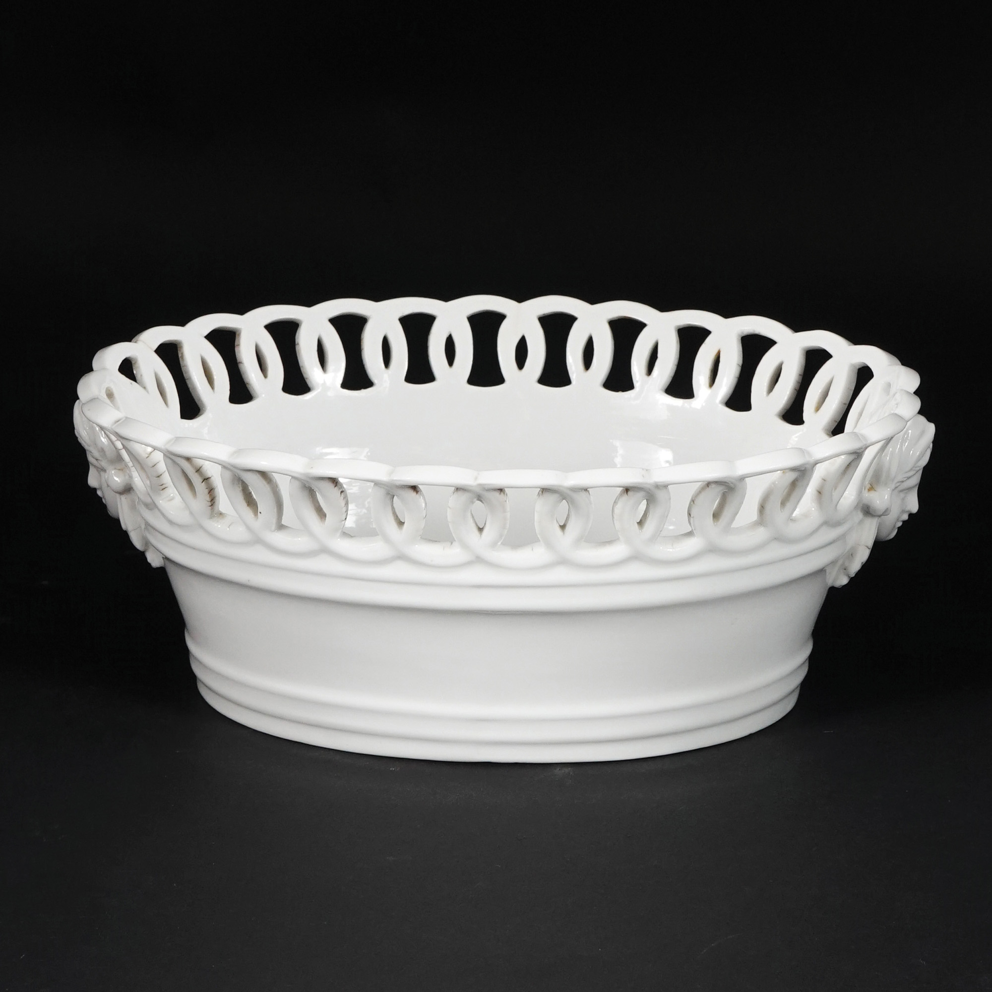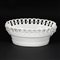 Cestino traforato in porcellana bianca con due anse a testina muliebre.