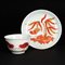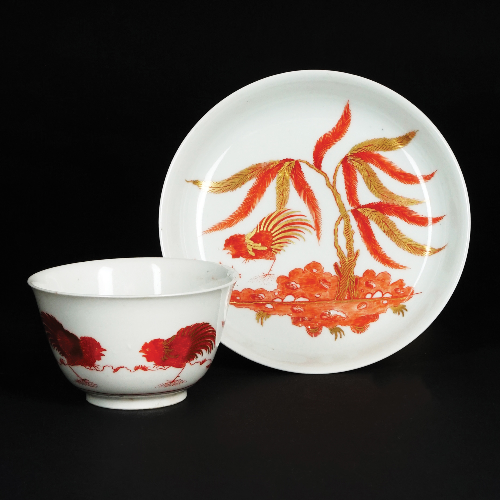 Tazza con piatto in porcellana bianca e dorata dipinta nelle tonalità del rosso ferro "a galletto": un gallo con fare minaccioso affianca un salice dalle corpose radici.