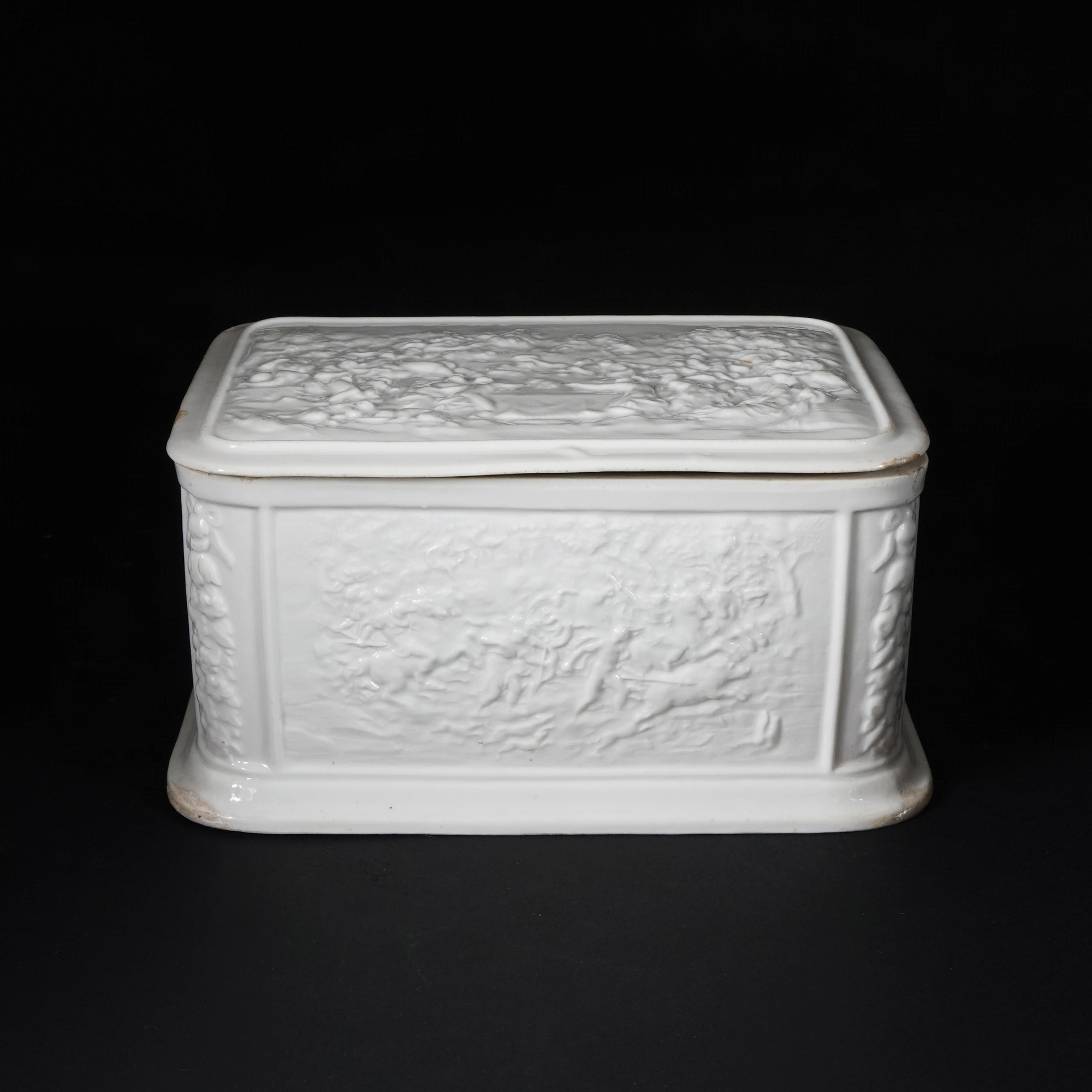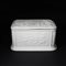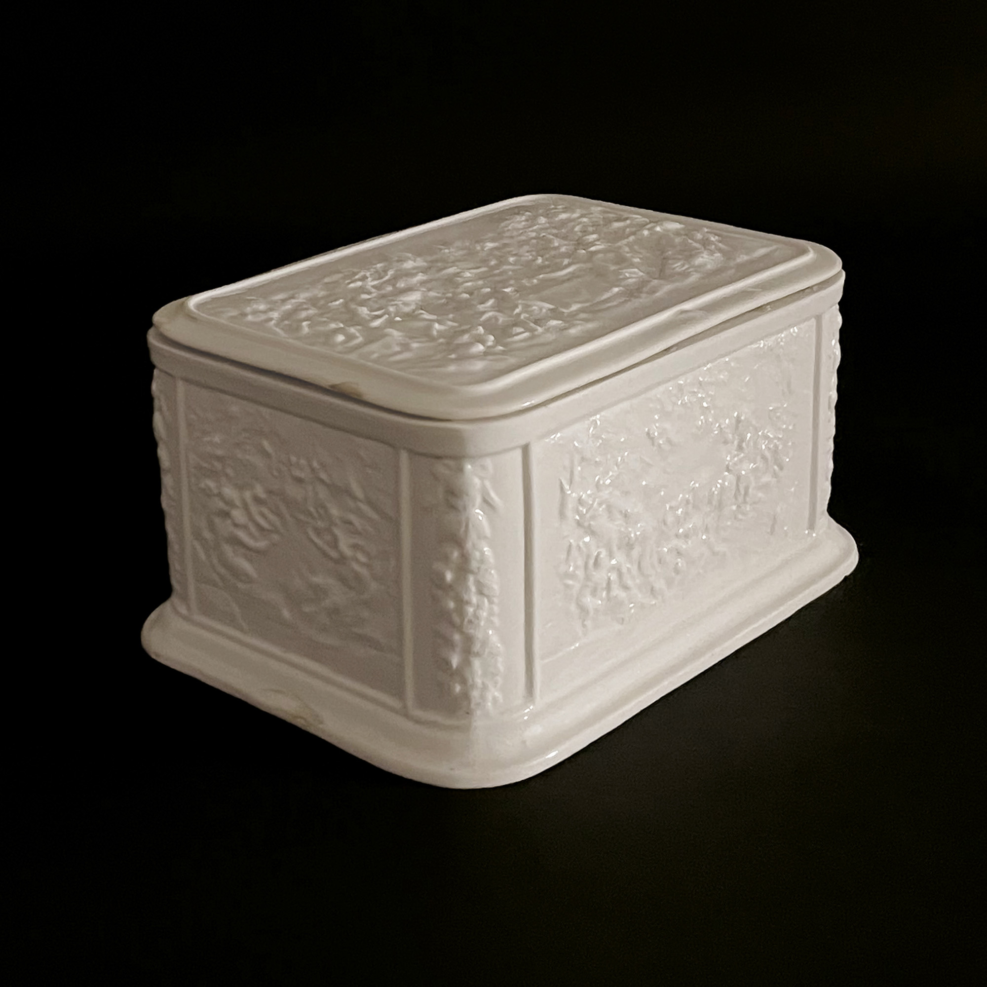 Scatola con coperchio in porcellana bianca di forma rettangolare con pareti modellate a bassorilievo istoriato.